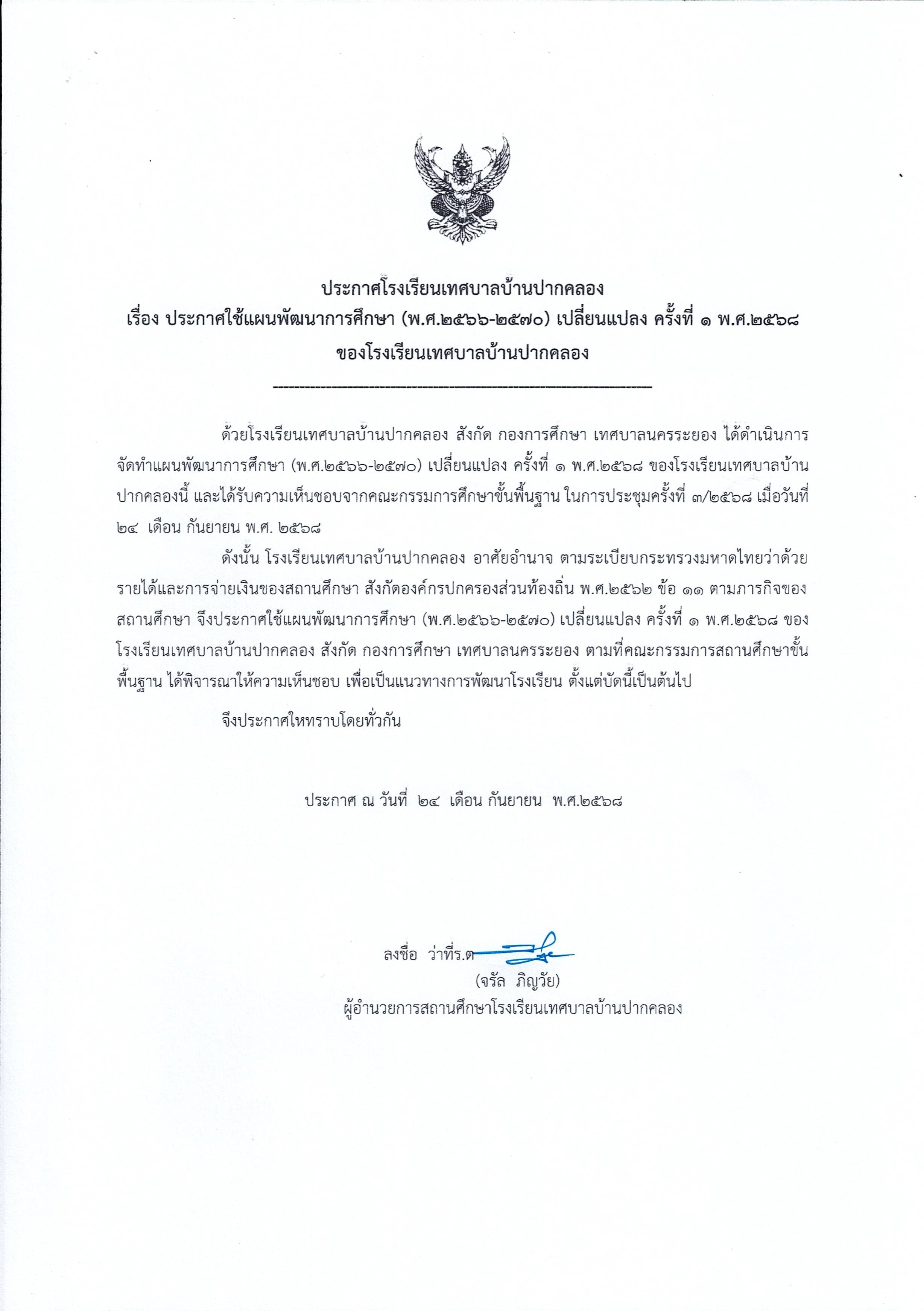 โรงเรียนเทศบาลบ้านปากคลอง ประกาศใช้แผนพัฒนาการศึกษา (พ.ศ.๒๕๖๖-๒๕๗๐) เปลี่ยนแปลง ครั้งที่ ๑ พ.ศ.๒๕๖๘